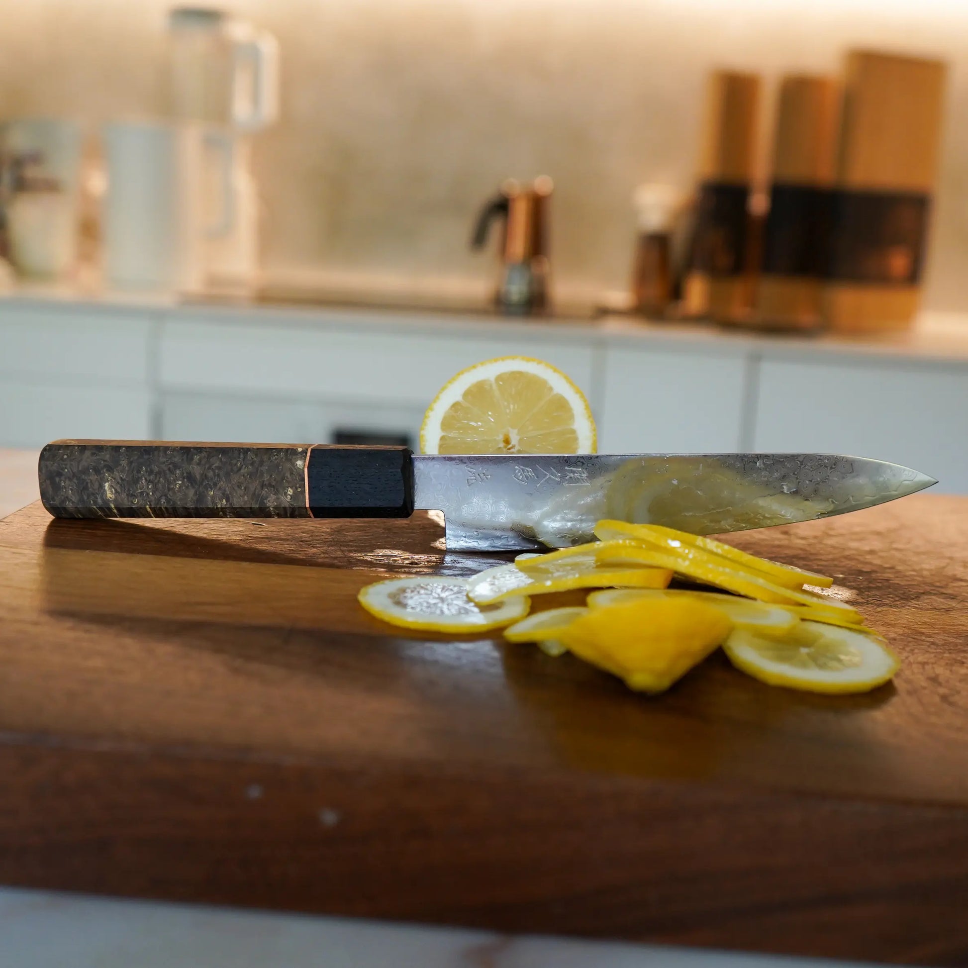 Son habillage damassé à 33 couches renforce non seulement la solidité du couteau, mais crée également cet effet scintillant signature, reflétant la lumière comme des ondulations à la surface de l’eau. Plus qu’une performance, c’est une poésie en acier.